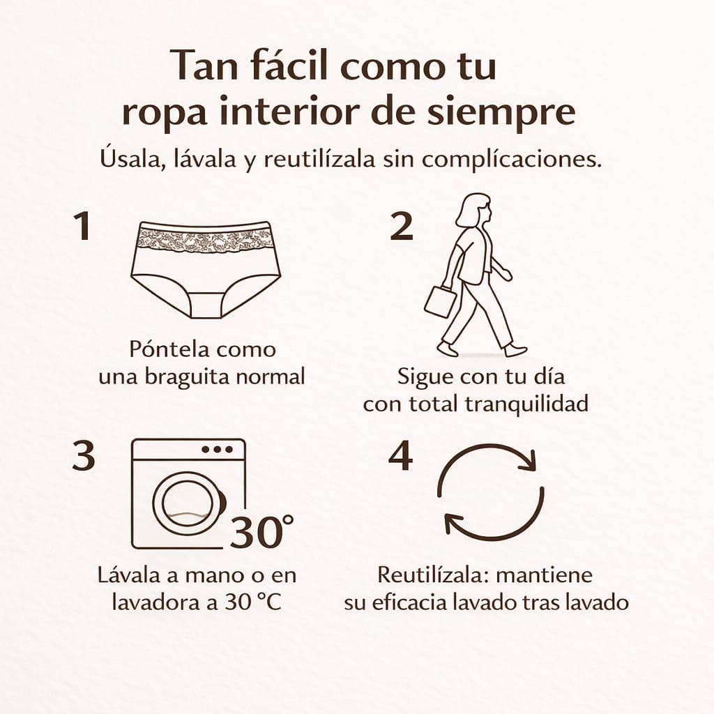 Tengo 52 años y buscaba algo discreto para pequeñas fugas, sin sentirme incómoda. Estas braguitas cumplen su función perfectamente. Me siento segura todo el día y puedo hacer vida normal sin preocuparme.